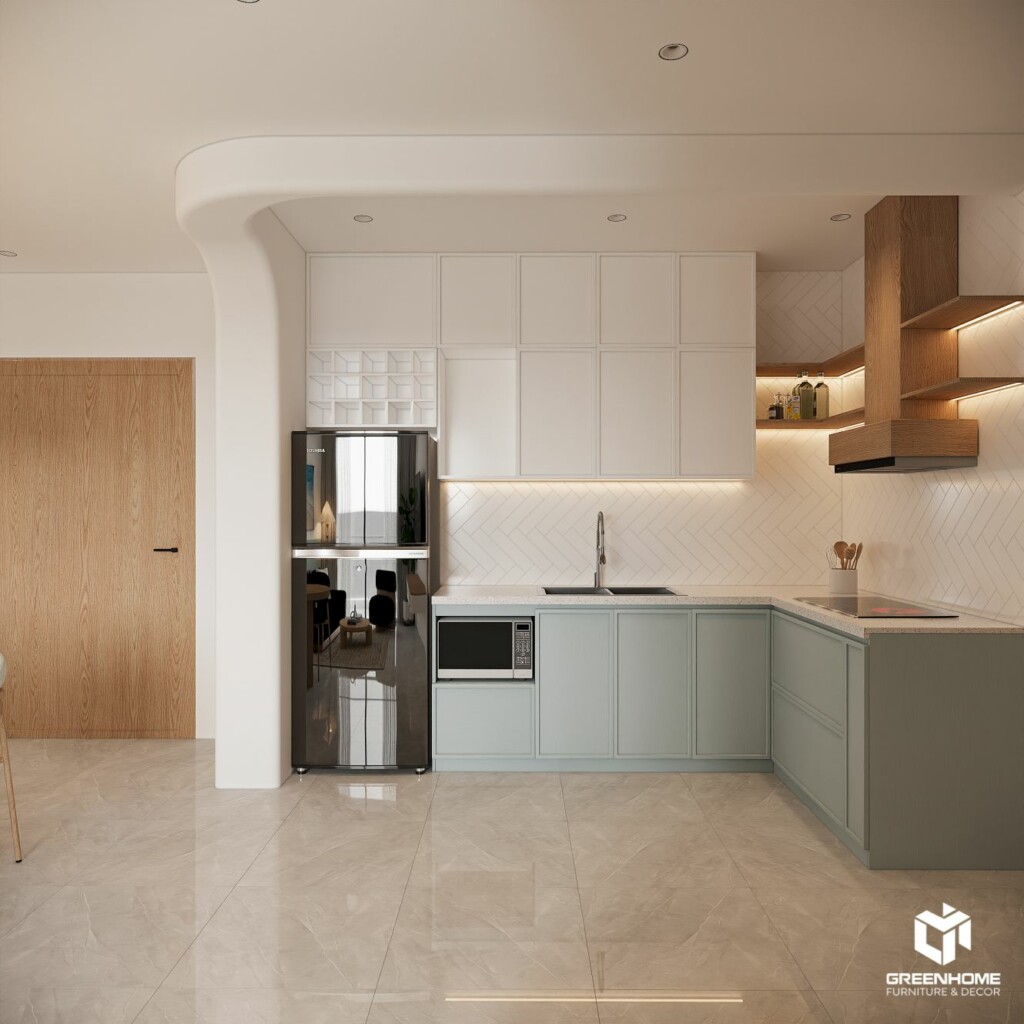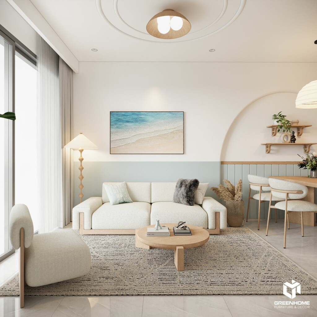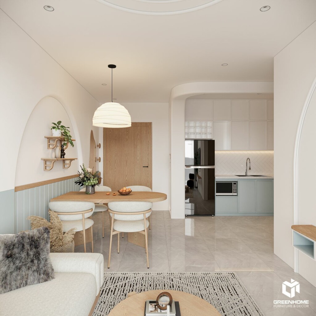 Gia chủ muốn sửa sang nội thất căn hộ 72m2 này thành căn hộ cho những chuyên gia thuê. Do đó, tiêu chí thiết kế đơn giản, nhẹ nhàng nhưng không quá trẻ trung được đặt lên hàng đầu. Sau nhiều nghiên cứu và trao đổi, GreenHome đã quyết định chọn phong cách wabi sabi cho dự án lần này. Điểm đặc trưng của phong cách nội thất căn hộ Wabi Sabi Vũng Tàu tại đây chính là sự kết hợp giữa gam màu trung tính chủ đạo và sắc xanh pastel nhẹ nhàng – mang lại cảm giác an yên nhưng vẫn có điểm nhấn. Những bức tường trắng kem, sàn xi gạch màu sáng nhẹ và các chi tiết nội thất từ gỗ tự nhiên tạo nên một tổng thể hài hòa, gần gũi.