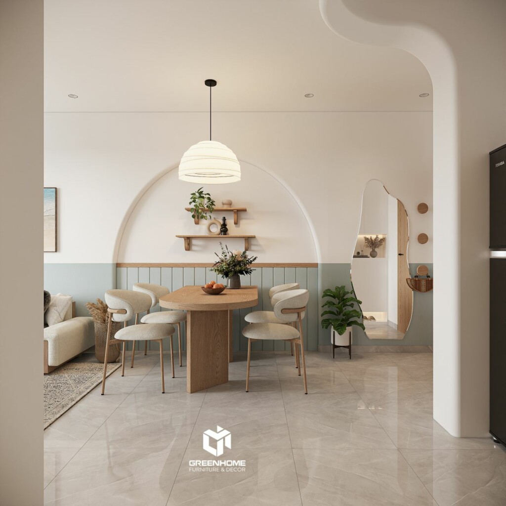 Một điểm nhấn tinh tế không thể bỏ qua là vách thạch cao bo cong ở khu vực bếp và bàn ăn. Thiết kế này vừa có tác dụng phân tách không gian một cách mềm mại, vừa góp phần làm dịu đi sự vuông vức, khô cứng – thể hiện rõ nét tinh thần "khiếm khuyết là một vẻ đẹp" của triết lý Wabi Sabi.