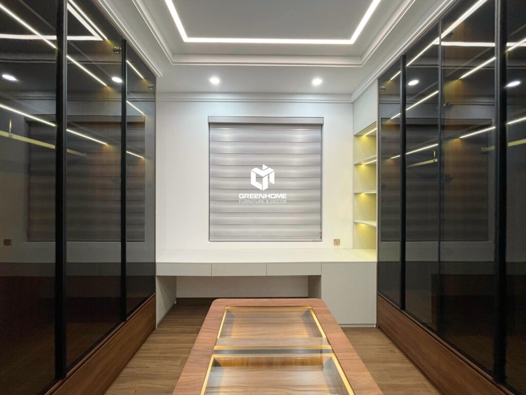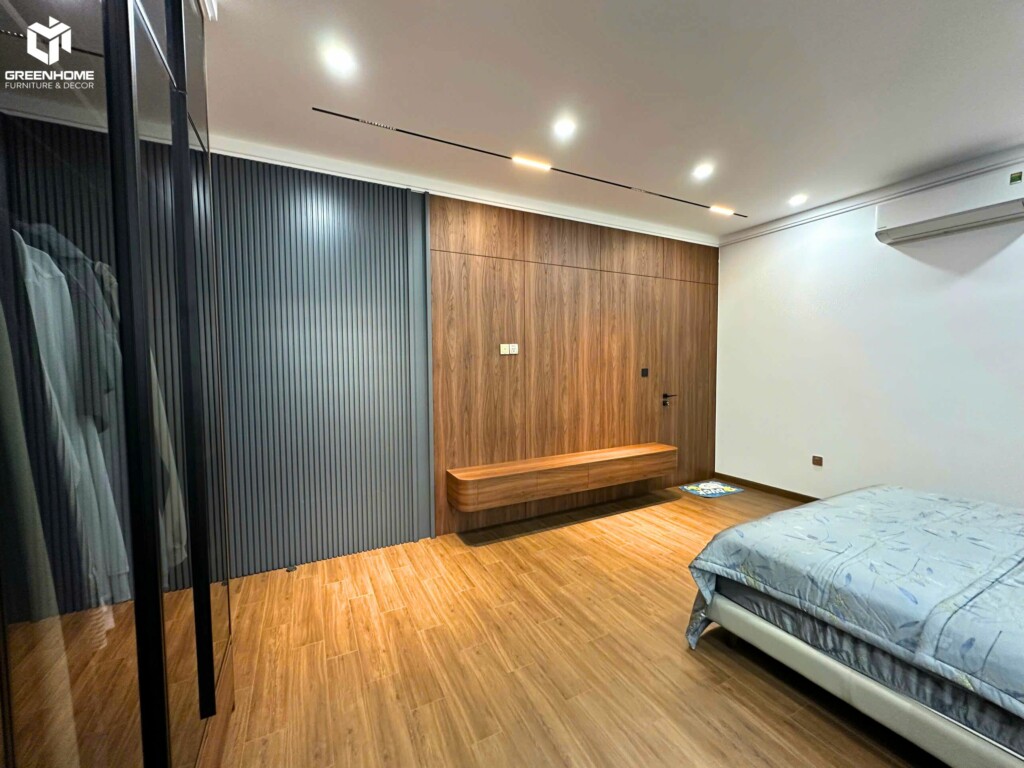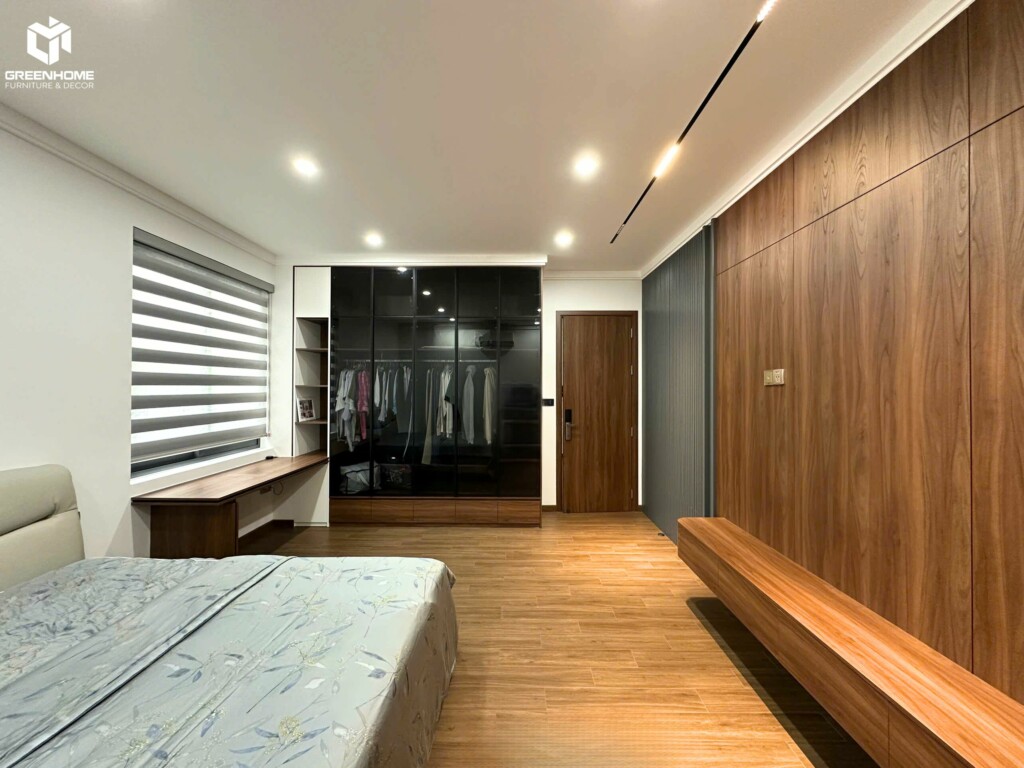 Phòng ngủ master rộng rãi với gam màu gỗ ấm ở các tủ nội thất và sàn nhà tạo cảm giác sang trọng. Không gian thay đồ rộng rãi, sức chứa lớn với các hệ tủ âm tường và tủ đứng cao, thiết kế thông minh giúp tối ưu hóa diện tích. Mỗi ngăn tủ đều được phân chia hợp lý, tạo thuận tiện cho việc lưu trữ và sắp xếp quần áo, phụ kiện.