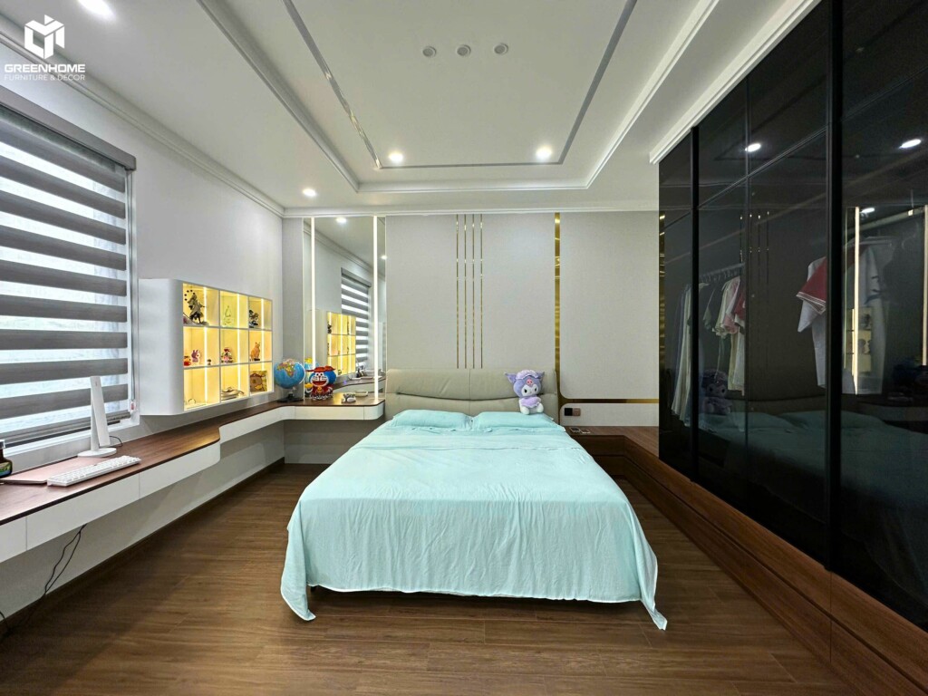Phòng ngủ bé trai đơn giản hơn với gam màu trầm. Tủ quần áo được thiết kế nhỏ hơn đôi chút so với phòng bé gái vì nhu cầu không nhiều. Bù lại, 1 phần tượng được để trống nhường chỗ cho việc lắp đặt máy chiếu và TV, tạo không gian thư giãn trong phòng phù hợp cho trẻ.