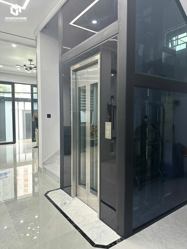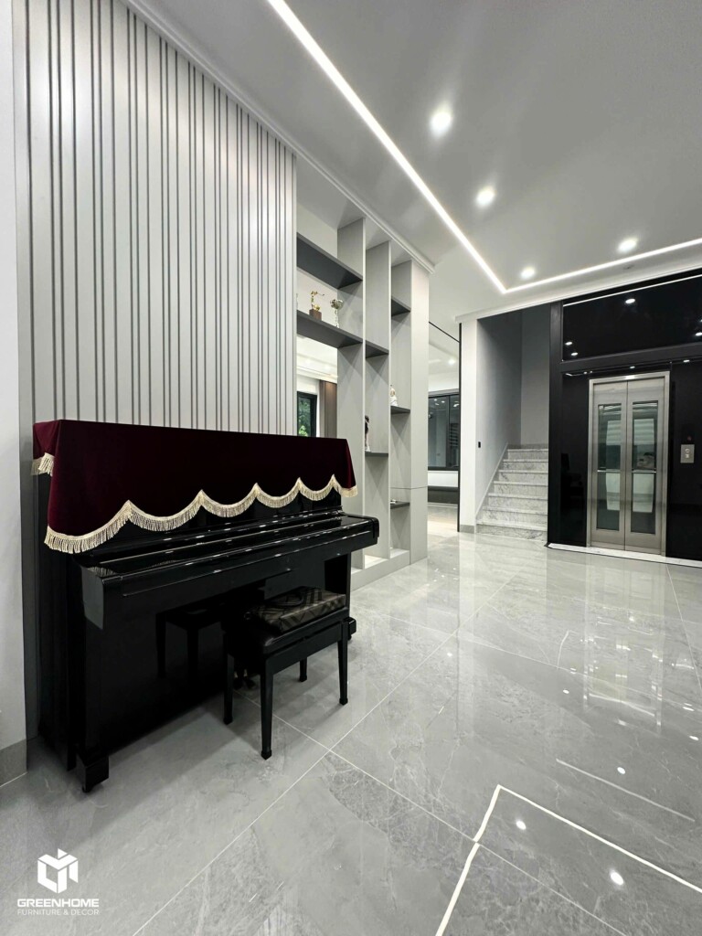 Không gian chuyển giao giữa phòng khách và phòng bếp là khu vực cầu thang máy và đàn piano. Thang máy được thiết kế trong suốt, tạo cảm giác nhẹ nhàng, hiện đại.