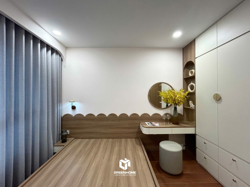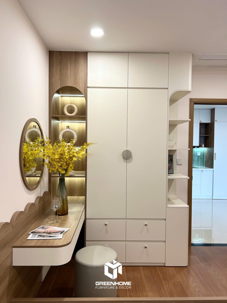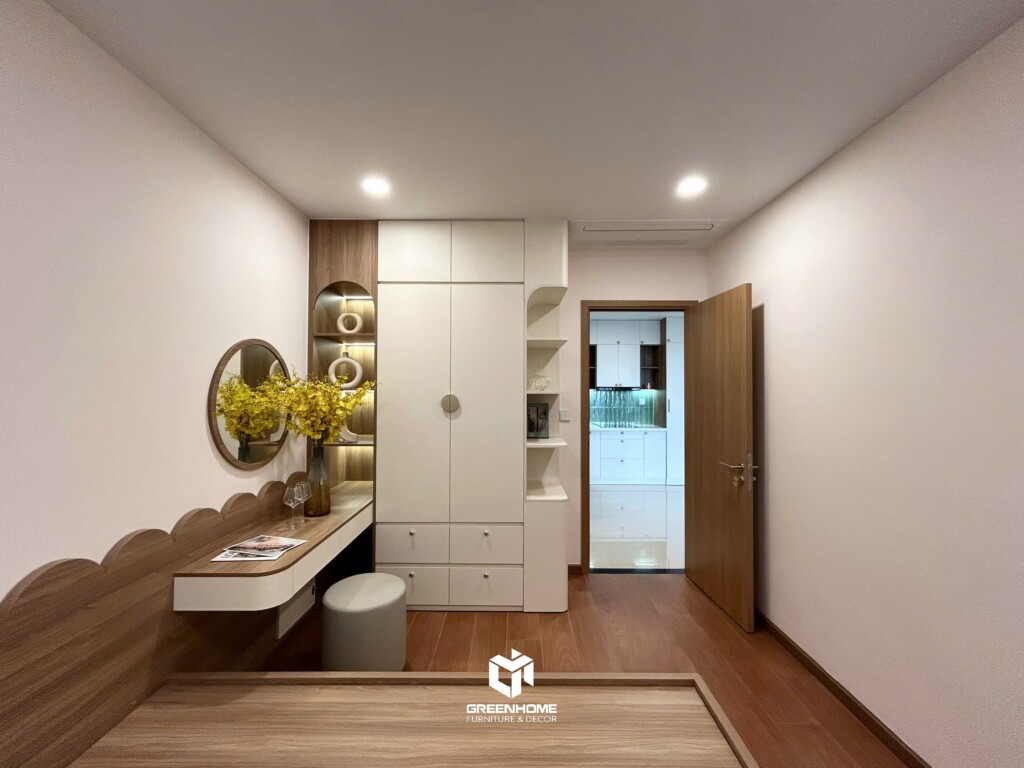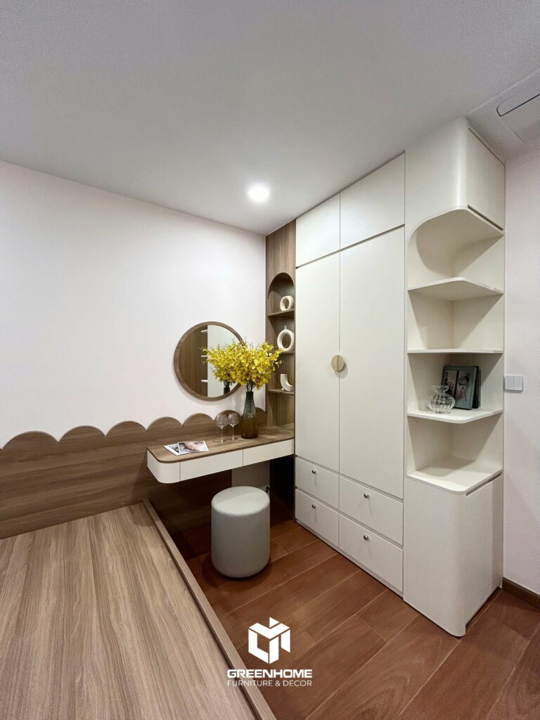 Tủ âm tường và bàn trang điểm nhỏ gọn giúp tối ưu diện tích, giữ căn phòng luôn gọn gàng, nhẹ nhàng.