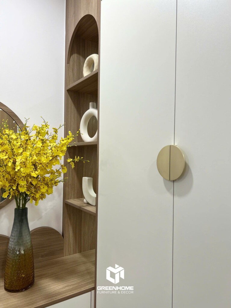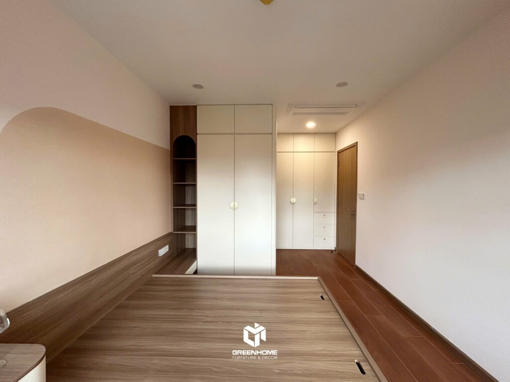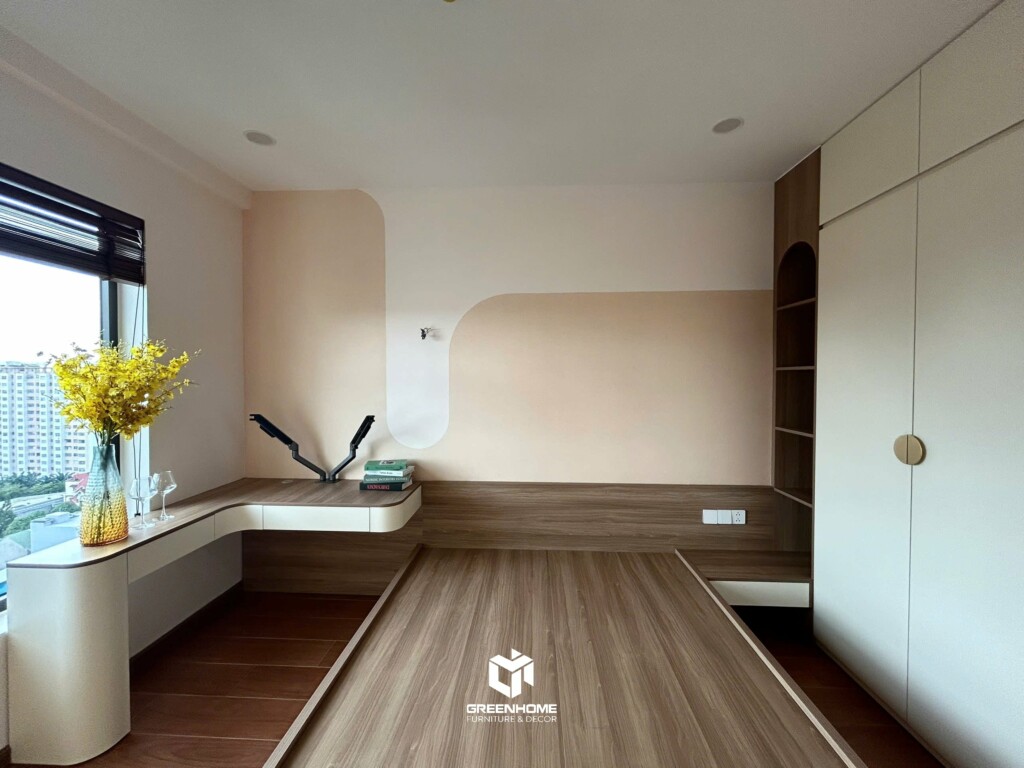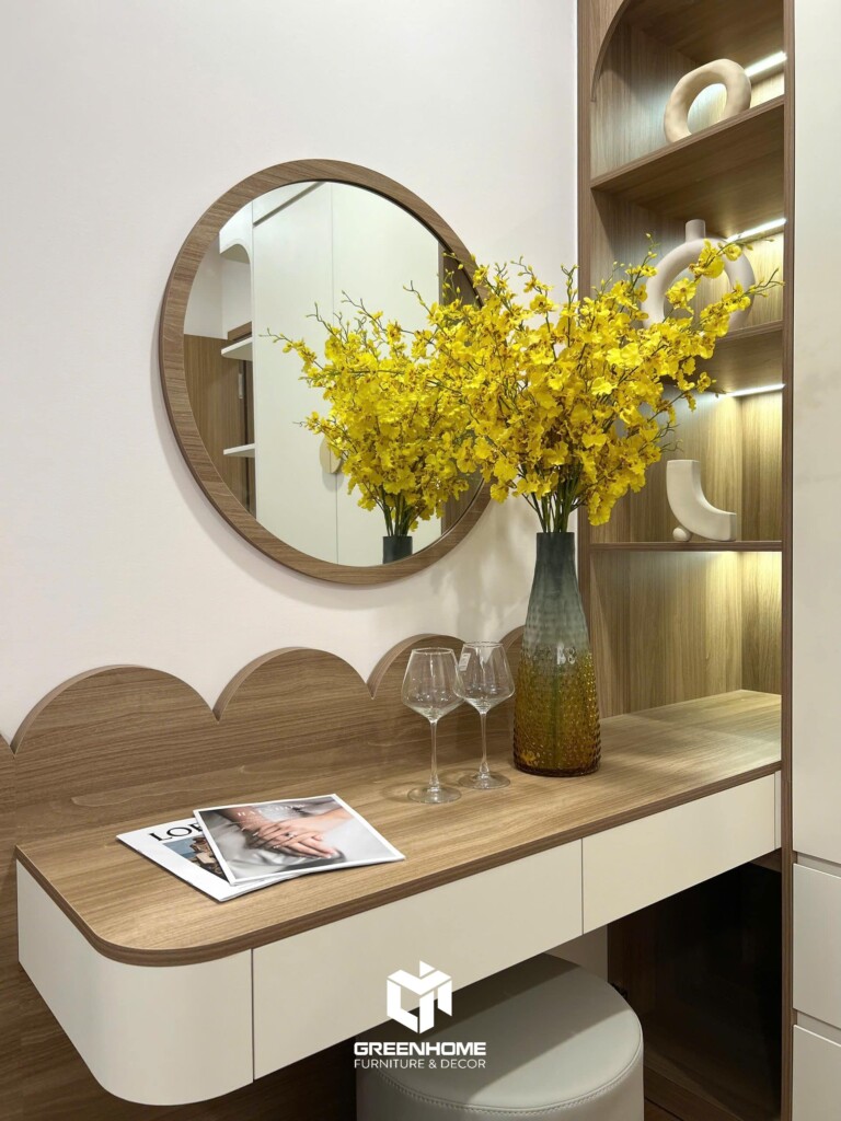 Tủ âm tường và bàn trang điểm nhỏ gọn giúp tối ưu diện tích, giữ căn phòng luôn gọn gàng, nhẹ nhàng.