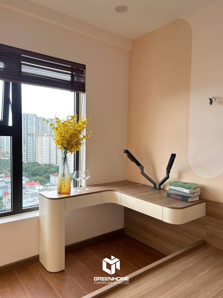 Bàn làm việc nhỏ được bố trí cạnh cửa sổ, tận dụng ánh sáng ban ngày cho những giờ đọc sách hay làm việc yên tĩnh.