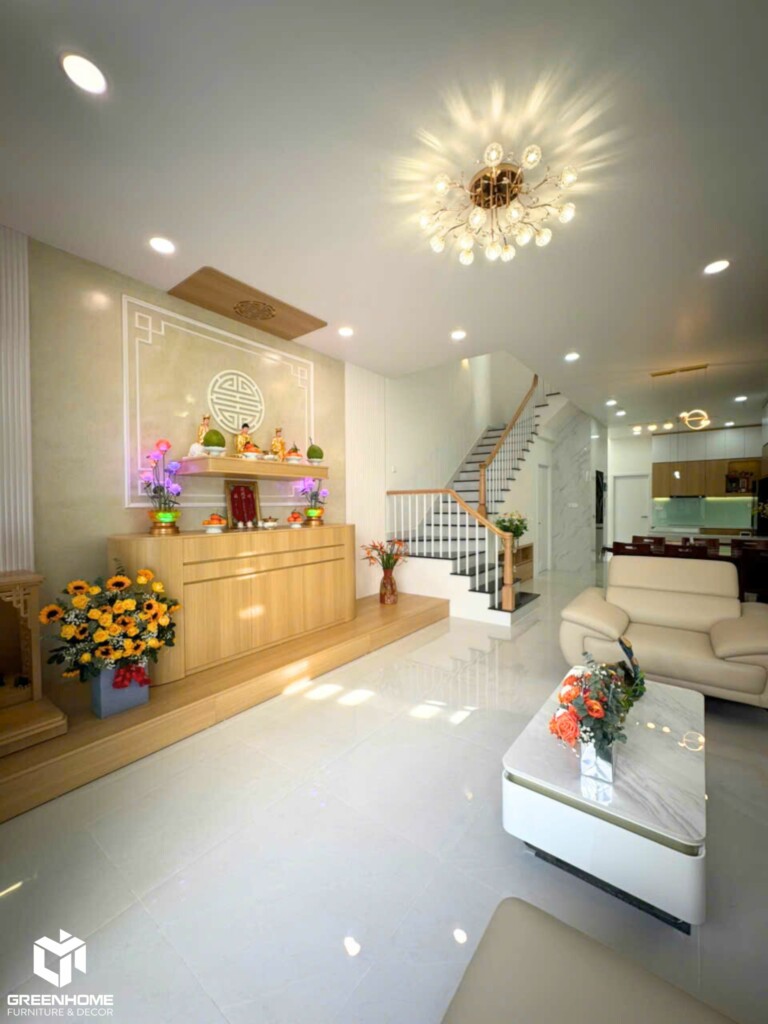 Ở dự án này, gia chủ mong muốn không gian thờ cúng trở thành điểm nhấn trang trọng và đáng chú ý nhất. Vì vậy đã dành riêng một phần tường lớn trong phòng khách để làm nơi thờ cúng. Thiết kế này không chỉ tạo ra một không gian linh thiêng mà còn mang đến sự tinh tế và sang trọng cho không gian chung của căn nhà.