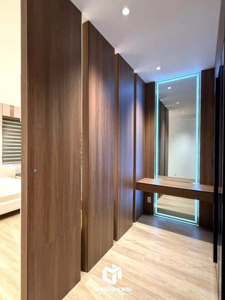 Bàn trang điểm được thiết kế liền mạch cùng gương đèn LED viền xanh nổi bật, vừa tiện nghi vừa là điểm nhấn độc đáo trong tổng thể thiết kế. Đây là một trong những góc hoàn thiện thể hiện rõ sự tỉ mỉ và chuẩn mực.