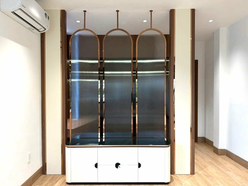 Bàn console gắn tường gọn gàng – nâng tầm thẩm mỹ cho không gian. Tủ kính cánh lùa ánh khói giúp lưu trữ tiện nghi mà vẫn sang trọng, chuẩn chỉ.
