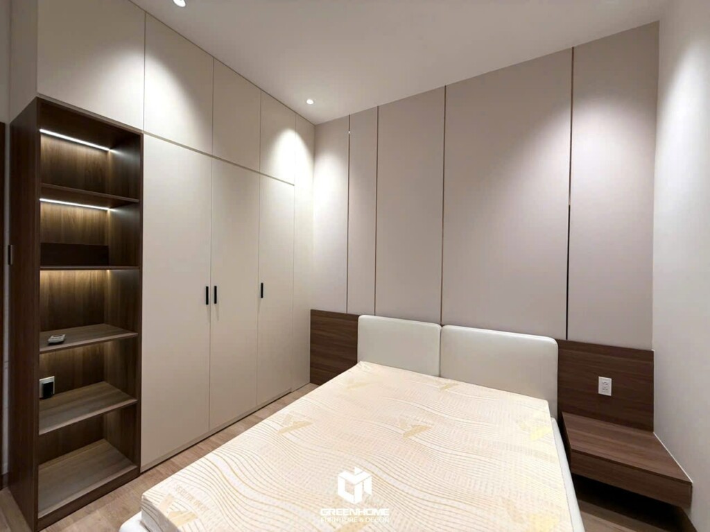 Không gian phòng ngủ được thiết kế tinh giản, tối ưu diện tích nhưng vẫn đảm bảo tính thẩm mỹ và tiện nghi. Tủ quần áo âm tường cao kịch trần kết hợp đèn hắt giúp không gian gọn gàng, hiện đại. Bảng đầu giường bọc nỉ và vách ốp chạy chỉ nhẹ nhàng, tạo cảm giác ấm cúng, thư giãn.