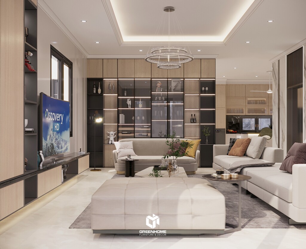 Thiết kế và thi công phòng sinh hoạt chung của biệt thự Vũng Tàu được tạo nên với phong cách hiện đại, tận dụng tối đa ánh sáng tự nhiên. Không gian mở kết hợp các tông màu trung tính như trắng, xám, be tạo cảm giác thoải mái và ấm cúng.
