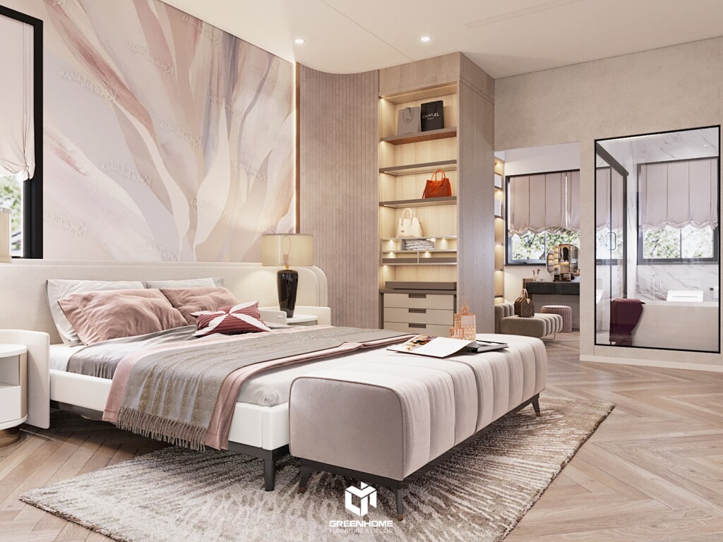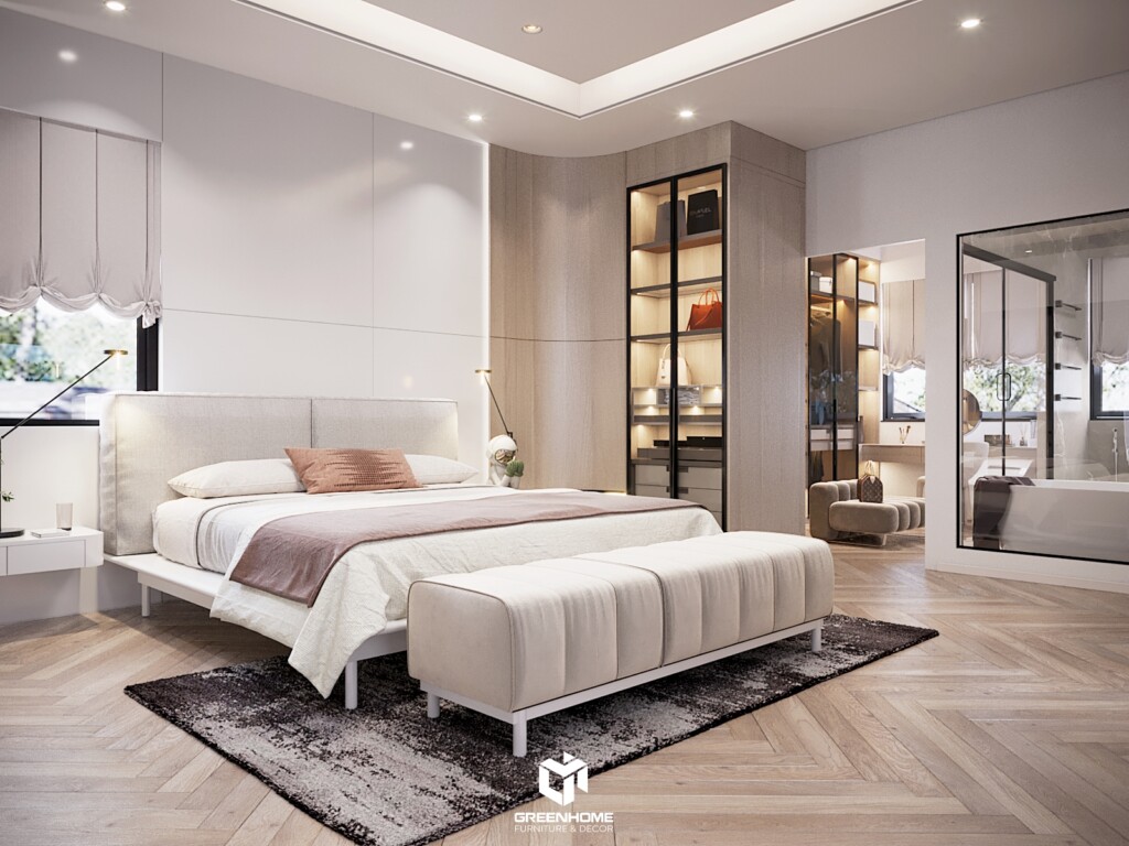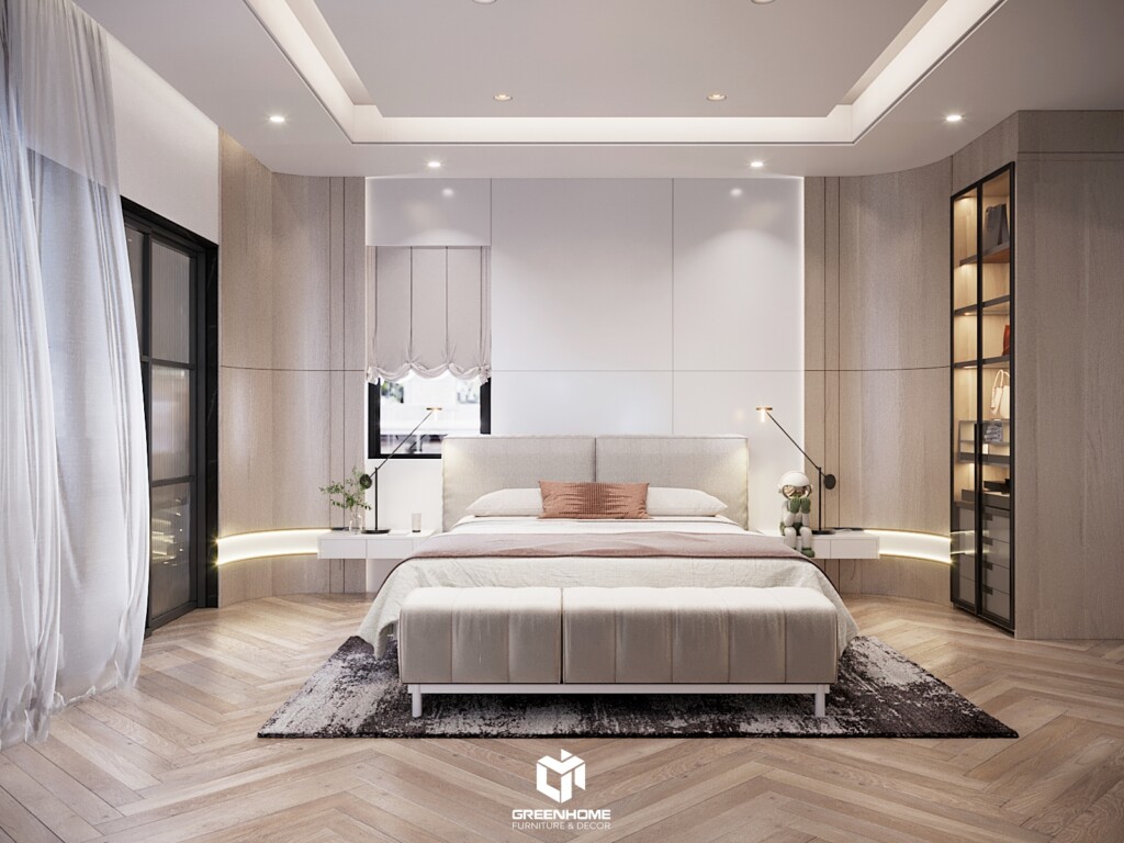 Nội thất phòng ngủ master sang trọng, quý phái với nhiều tiện ích. Không gian được phân phối hợp lí, thoáng đãng. Các chi tiết ván gỗ bo tròn mềm mại liên kết với những đường nét sắc sảo giúp tổng thể trở nên hài hòa, độc đáo.