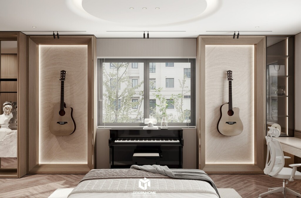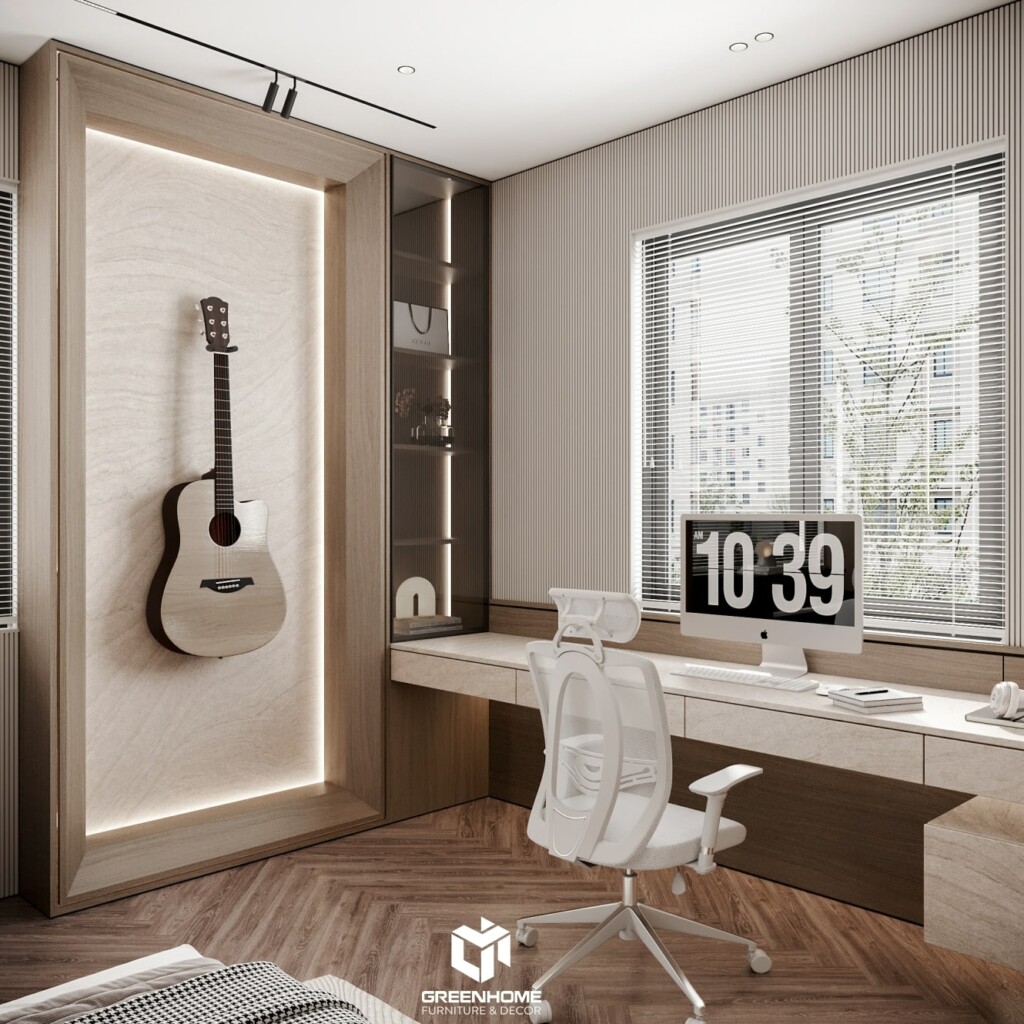 Góc làm việc được thiết kế theo phong cách hiện đại, tối giản nhưng vẫn đầy đủ tiện nghi. Ánh sáng tự nhiên tràn ngập qua ô cửa sổ lớn, kết hợp cùng gam màu trung tính tạo nên không gian làm việc lý tưởng, thư giãn. Chiếc ghế công thái học giúp tăng sự thoải mái, trong khi guitar treo tường lại mang đến điểm nhấn nghệ thuật cá tính. Đối diện đó, không gian tủ đồ được bố trí âm tường với hệ cửa kính sọc mờ sang trọng, vừa đảm bảo sự riêng tư vừa tạo cảm giác rộng thoáng. Từng chi tiết đều thể hiện gu thẩm mỹ tinh tế và đẳng cấp của gia chủ.