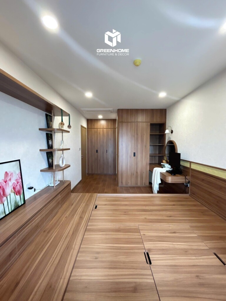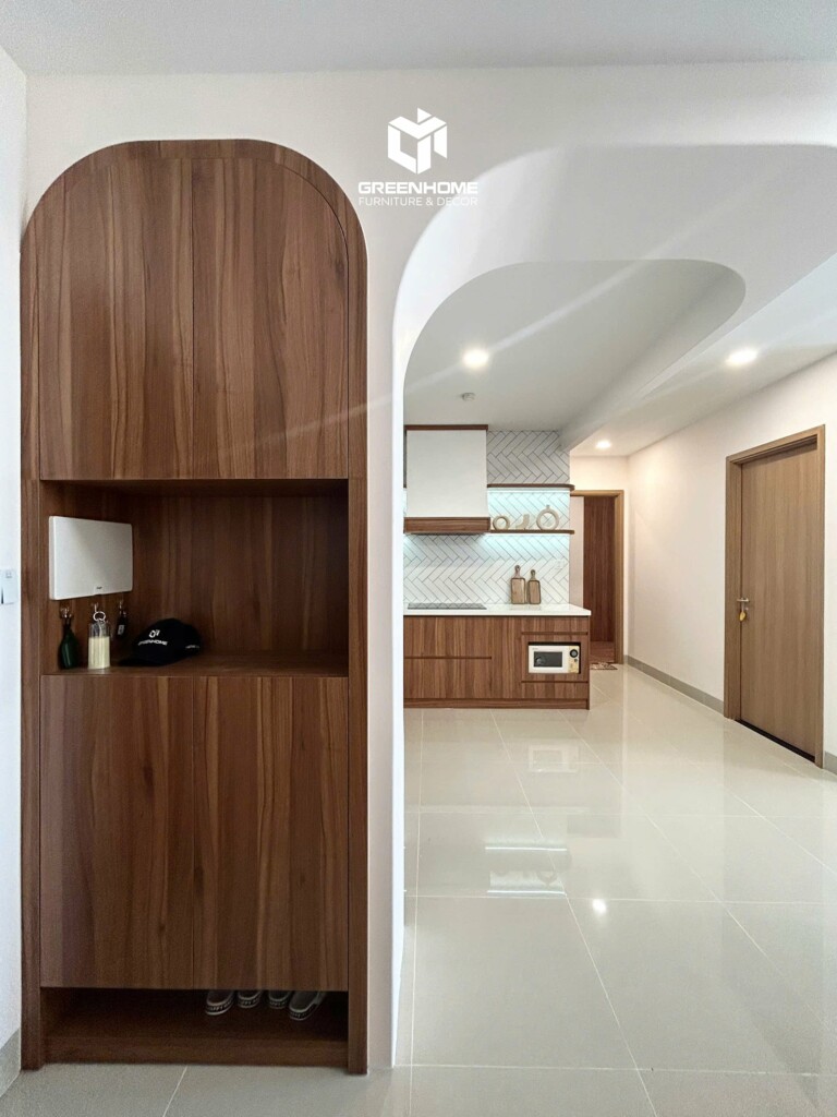 Không chỉ chú trọng thẩm mỹ, căn hộ còn được tính toán tỉ mỉ từng chi tiết để tối ưu công năng. Tủ kệ âm tường, hộc chứa ẩn dưới sàn, các góc nhỏ linh hoạt đều được khai thác triệt để, giúp căn hộ luôn gọn gàng và thoáng rộng nhưng vẫn giữ được sự ấm cúng.