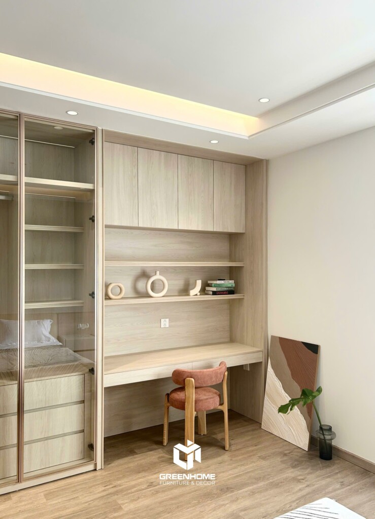 Thiết kế liền mạch giữa hệ tủ quần áo, kệ trang trí và bàn làm việc tạo nên một khối tổng thể gọn gàng, liền lạc. Toàn bộ nội thất sử dụng chất liệu gỗ công nghiệp phủ melamine vân sồi sáng, vừa hiện đại vừa dễ kết hợp màu sắc.