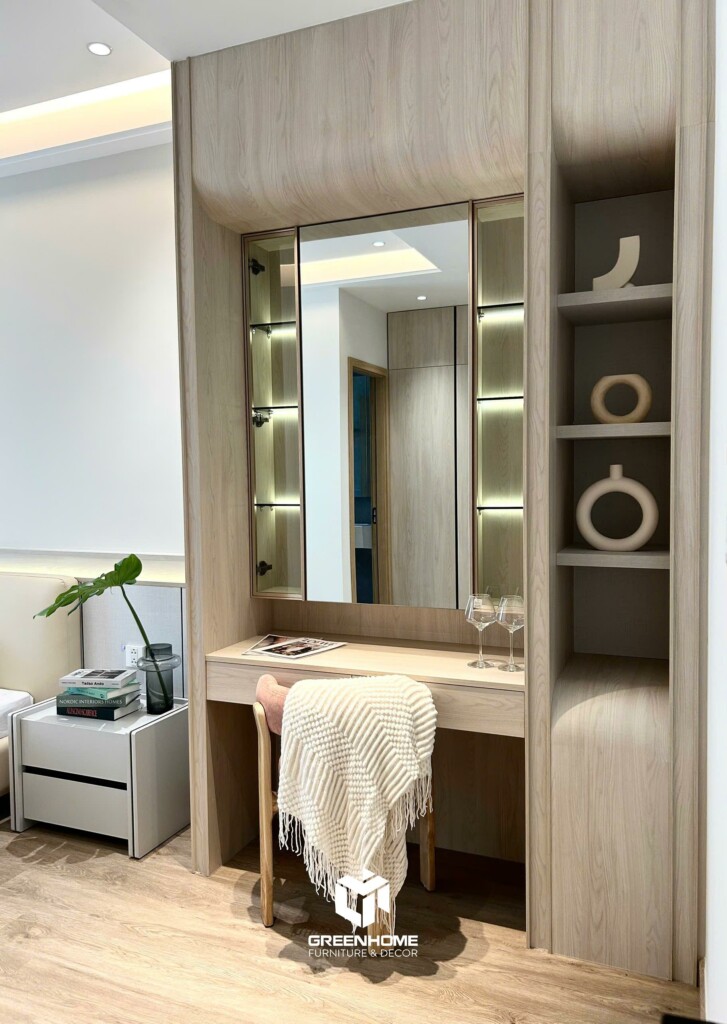 Bàn trang điểm kết hợp gương lớn và hệ tủ trang trí bo cong, mềm mại, là điểm nhấn nữ tính và hiện đại cho căn phòng. Sàn gỗ công nghiệp tông nâu ấm cùng ánh sáng tự nhiên từ cửa kính lớn mang đến sự hài hòa giữa tiện nghi và thiên nhiên, đúng chuẩn một không gian nghỉ ngơi lý tưởng cho gia chủ.