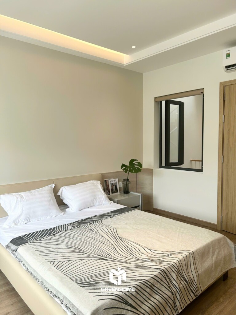 Không gian phòng ngủ được thiết kế theo phong cách hiện đại với tông màu trung tính nhẹ nhàng, mang lại cảm giác thư giãn tuyệt đối. Giường ngủ bọc da cao cấp kết hợp hệ vách đầu giường tích hợp đèn LED hắt sáng dịu, tạo chiều sâu và cảm giác ấm áp. Tủ quần áo cao kịch trần, thiết kế âm tường với bề mặt laminate vân gỗ sáng giúp mở rộng thị giác, đồng thời tối ưu hóa không gian lưu trữ.
