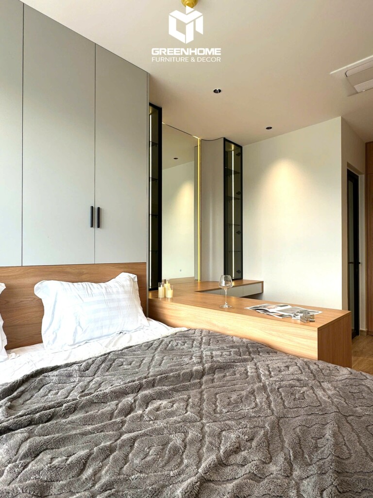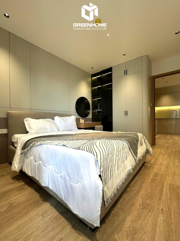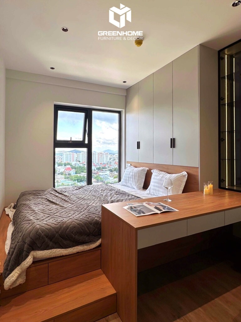 Phòng ngủ 1 tại Vũng Tàu Centre Point tông màu gam sáng chủ đạo, tạo cảm giác rộng rãi thư giãn. Giường ngủ được bố trí trên bục gỗ cao, nổi bật với nét hiện đại và bố cục cân đối tinh tế. Bàn làm việc thông minh liền kề giường ngủ, tăng tiện nghi và điểm nhấn thẩm mỹ cho không gian