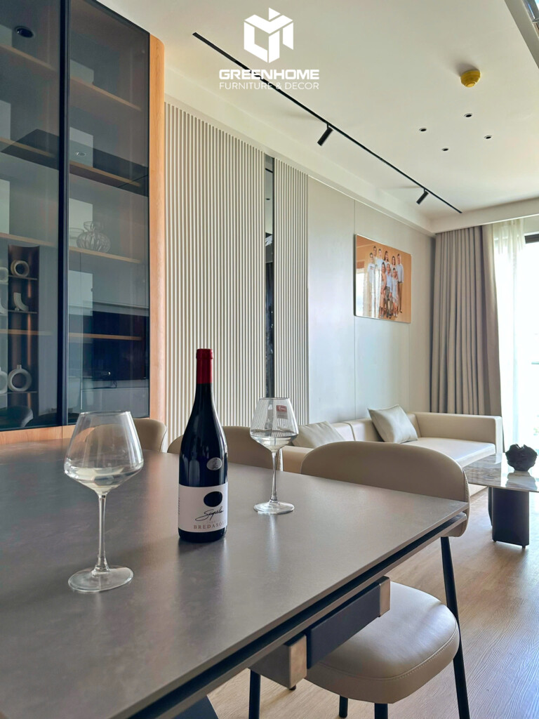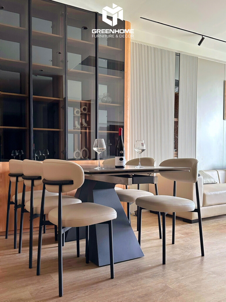 Hệ tủ trang trí là sự kết hợp hài hòa giữa gỗ An Cường và kính cường lực tông đen ấn tượng. Đây vừa là điểm nhấn thẩm mỹ, tăng chiều sâu thị giác, vừa tối ưu công năng lưu trữ. Bàn ăn thông minh có thể kéo dài linh hoạt, ghế đệm màu kem hài hòa theo phối cảnh, tất cả tạo nên tổng thể hiện đại, tiện nghi.