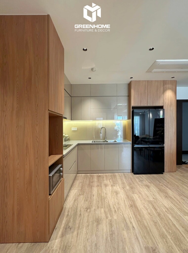 Không gian bếp chữ L phối hợp gỗ An Cường và Acrylic An Cường bóng gương hiện đại , sạch sẽ. Thiết kế công năng tối ưu, phân khu rõ ràng giữa nấu- rửa- lưu trữ, thuận tiện cho thao tác nấu nướng.