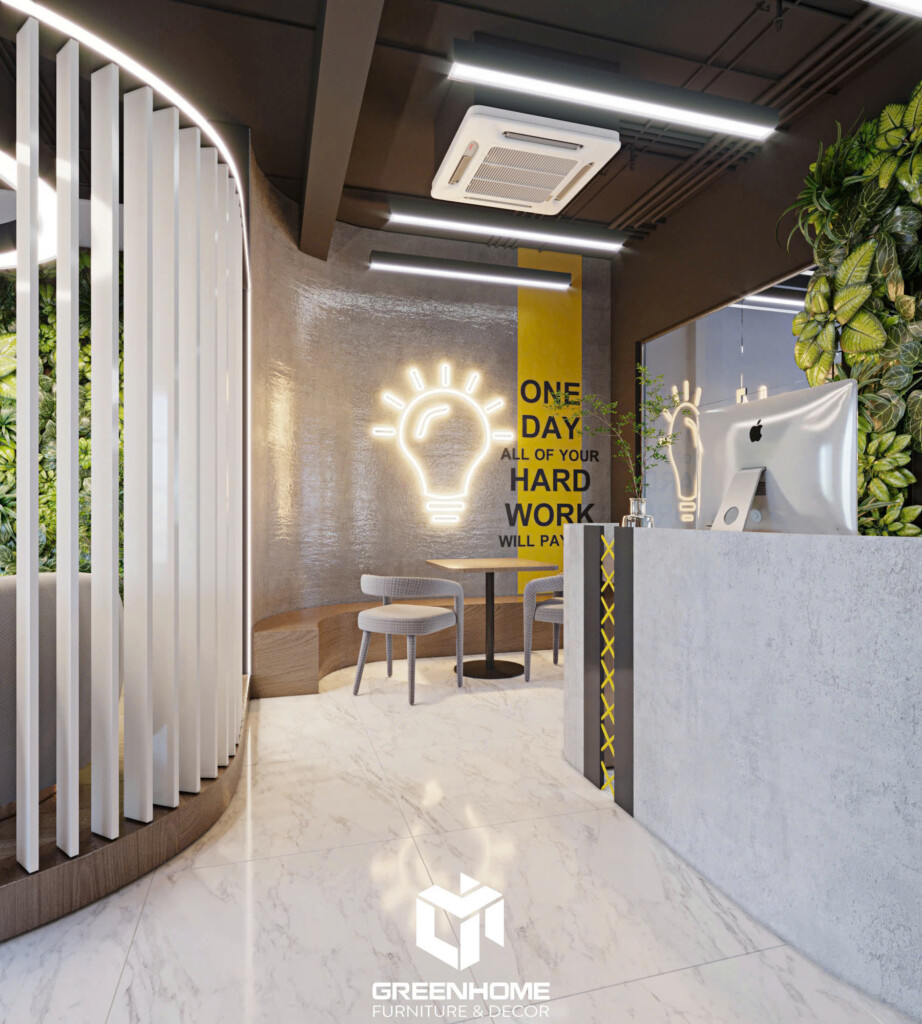 Mỗi chi tiết trong không gian làm việc – từ câu quote truyền động lực, đến cách phối màu đen – vàng mạnh mẽ – đều là một phần trong chiến lược xây dựng bản sắc doanh nghiệp. Một văn phòng IT không chỉ cần đẹp, mà còn cần thông minh, cảm hứng và hiệu quả. Và đó chính là giá trị cốt lõi mà thiết kế nội thất văn phòng cao cấp mang lại cho doanh nghiệp hiện đại.