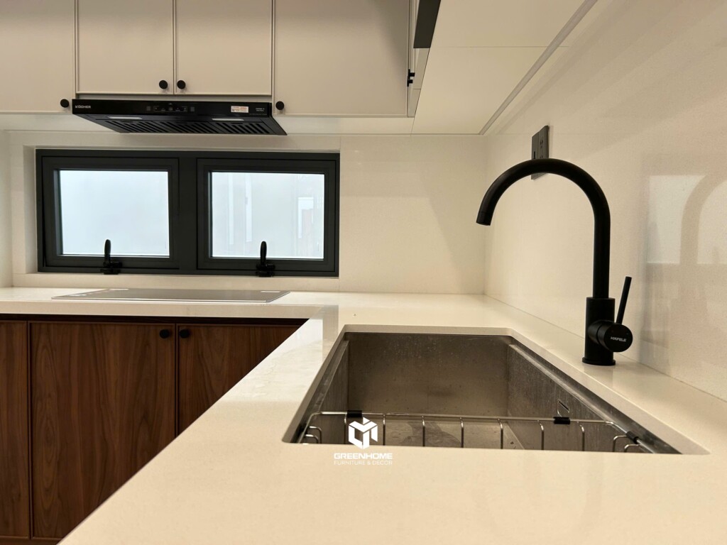Khu vực khách và bếp giao thoa mượt mà, thuận tiện sinh hoạt