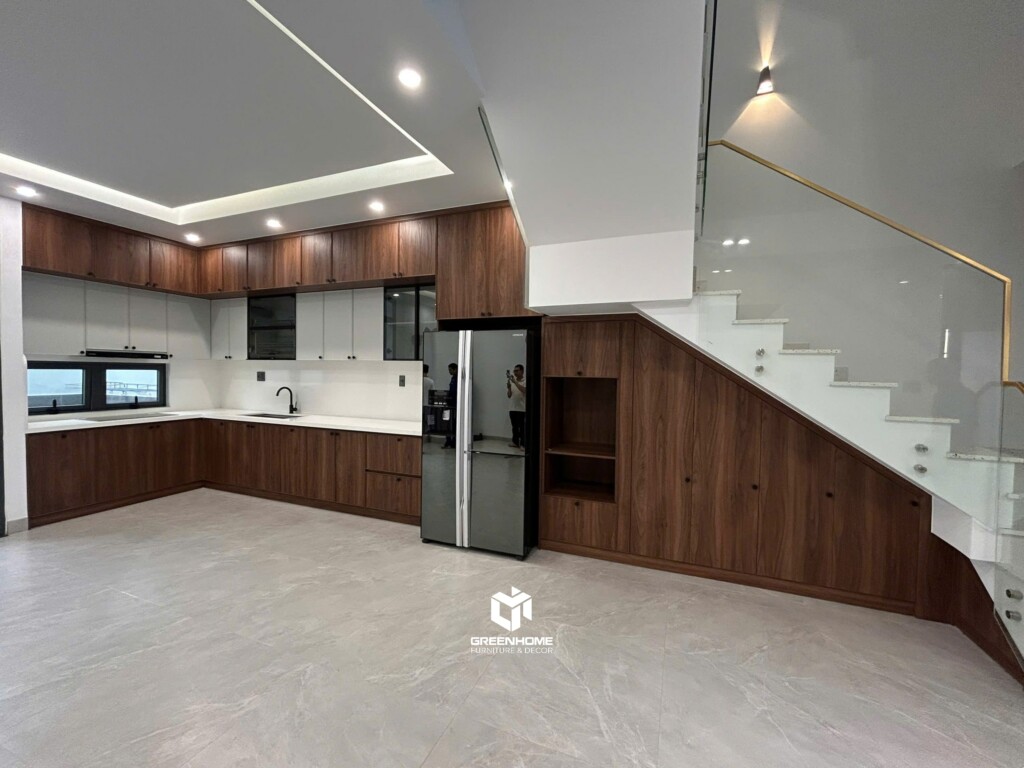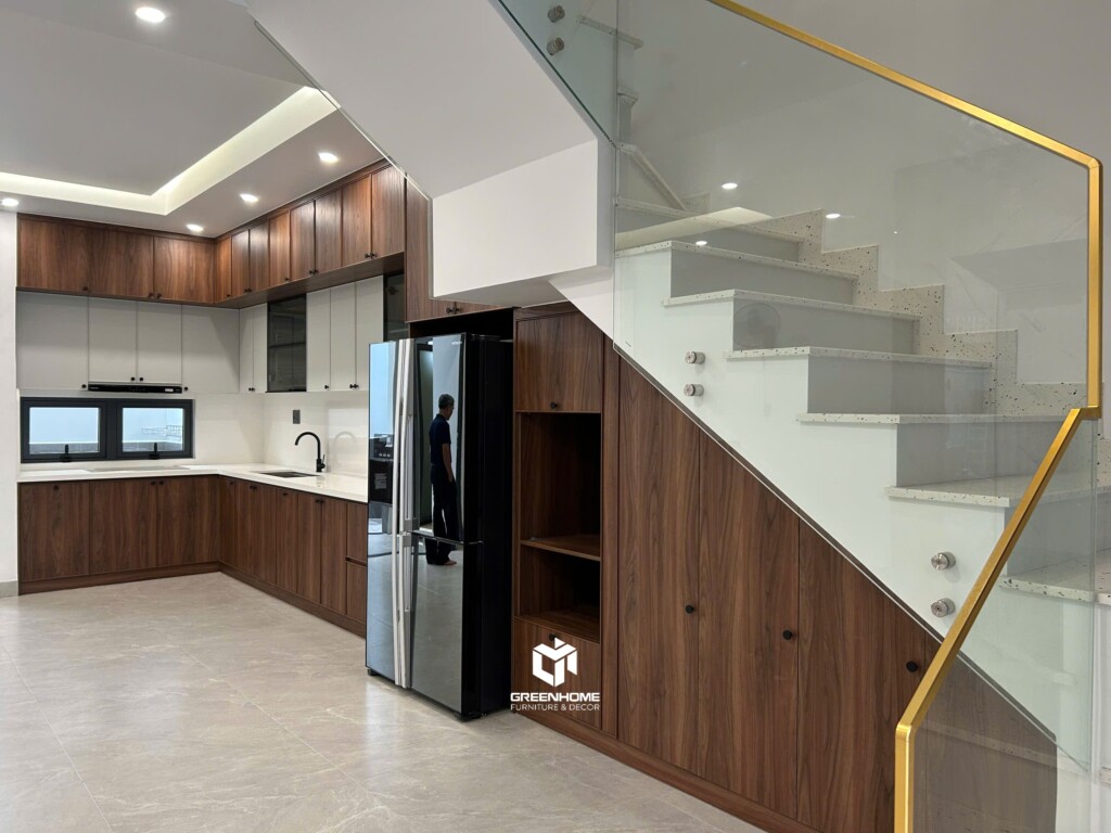 Không gian tầng trệt được tổ chức theo xu hướng khách – bếp liên thông, giúp tối ưu diện tích và tạo cảm giác liền mạch.