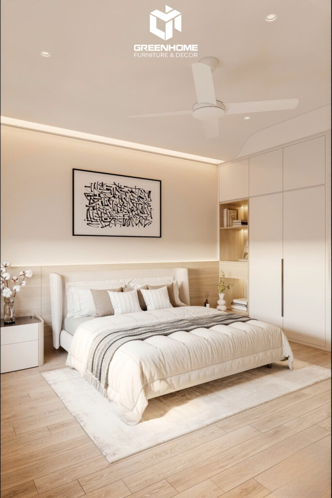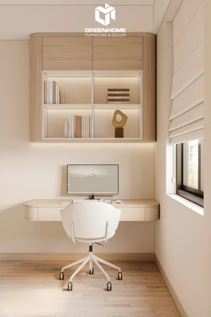 Màu sắc trung tính và chất liệu gỗ sáng mang đến sự thư thái, ấm cúng và đầy đủ công năng. Từng khu vực như giường ngủ, góc làm việc được bố trí thông minh, tận dụng tối đa ánh sáng tự nhiên. Đảm bảo không gian sống vừa hiện đại vừa gần gũi với thiên nhiên.