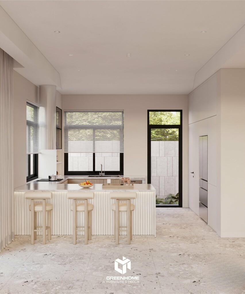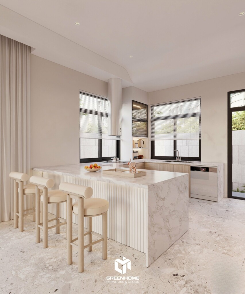 Không gian bếp Greenhome thiết kế theo phong cách tối giản hiện đại, hài hòa với tổng thể kiến trúc nhà vườn Lavida. Đảo bếp đá vân mây và hệ tủ gỗ sáng màu tạo cảm giác sạch sẽ, nhẹ nhàng, tinh tế và sang trọng. Mỗi chi tiết nội thất được tính toán kỹ, đảm bảo công năng, tận dụng ánh sáng tự nhiên và phù hợp thói quen gia chủ.