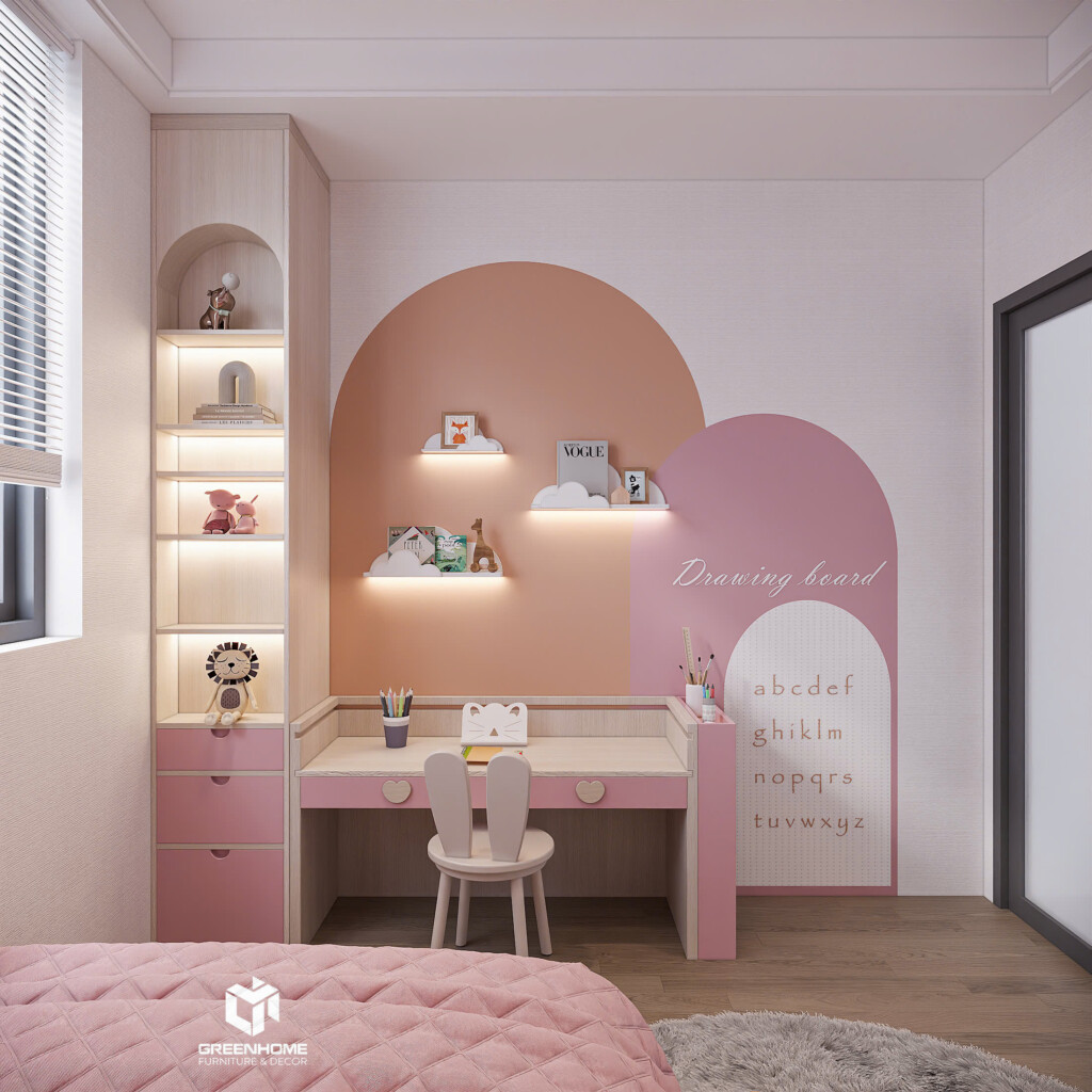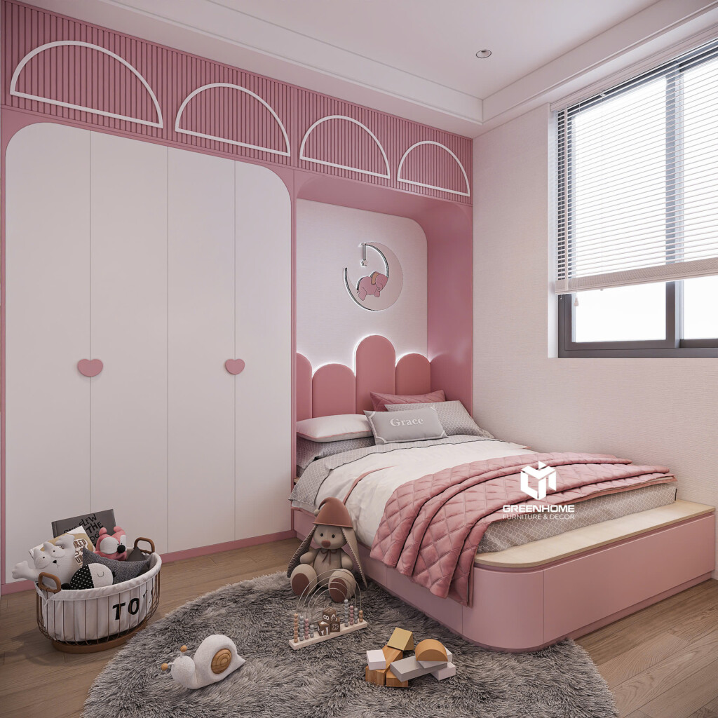 Phòng ngủ cho bé dễ thương với gam màu hồng cùng các đường cong mềm mại từ chi tiết nội thất, góp phần tạo không gian lành mạnh cho trẻ sinh hoạt.