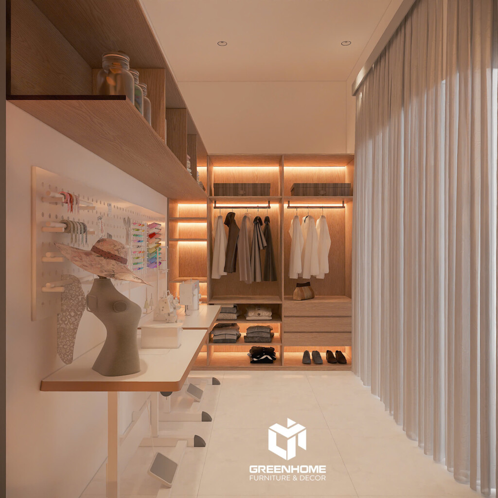 Phòng thay đồ với nhiều tiện ích, được thiết kế lược bỏ cánh cửa nhằm tạo sự thông thoáng và thuận tiện khi sử dụng. Hệ tủ kệ mở giúp tối ưu không gian lưu trữ, dễ dàng quan sát và lựa chọn trang phục. Chất liệu gỗ kết hợp ánh sáng tinh tế mang đến cảm giác sang trọng, hiện đại.