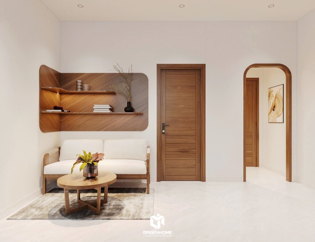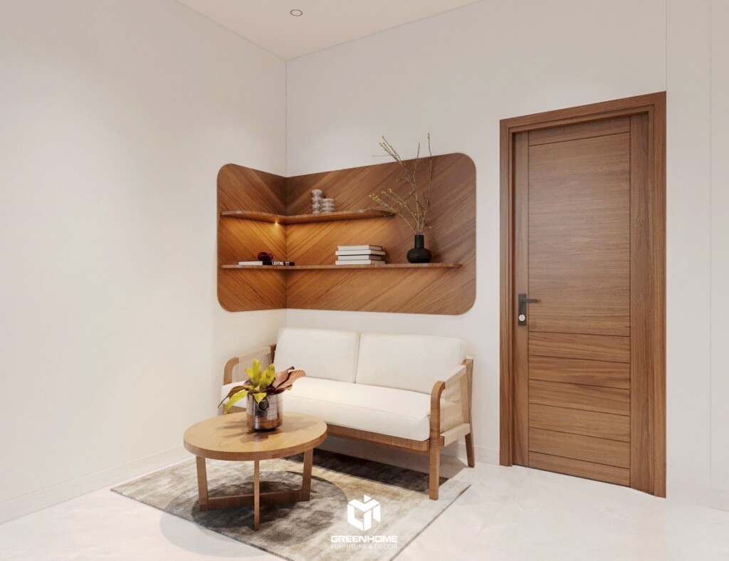 Khu vực sinh hoạt chung này nằm tại tầng cao của căn nhà. Được thiết kế tinh tế, tối giản nhưng vẫn đầy đủ công năng, phù hợp với phong cách nội thất biệt thự hiện đại Vũng Tàu. Các chi tiết gỗ ấm áp từ cửa, kệ trang trí cho đến bộ sofa nhỏ nhắn kết hợp hoàn hảo với nền tường trắng sáng, tạo nên không gian vừa gần gũi, vừa sang trọng. Góc thư giãn nhỏ này còn được điểm xuyết bởi những món decor nhẹ nhàng. Làm nổi bật tinh thần của nội thất biệt thự hiện đại Vũng Tàu - nơi đề cao sự thoải mái và gu thẩm mỹ tinh tế.