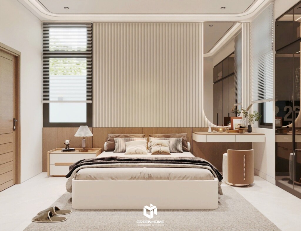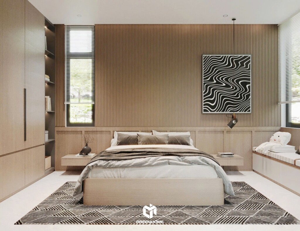 Bốn phòng ngủ trong căn biệt thự này được thiết kế theo phong cách tinh tế, hiện đại và đầy tiện nghi. Mỗi phòng đều có cách bài trí riêng biệt, nhưng vẫn thống nhất trong tổng thể với gam màu trung tính nhẹ nhàng và vật liệu gỗ tự nhiên ấm áp.