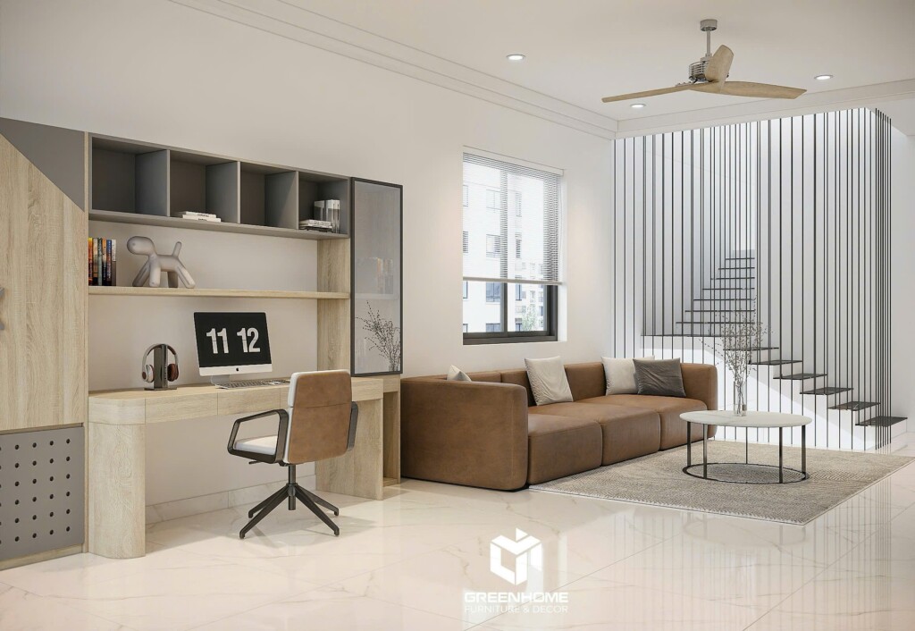Không gian phòng khách rộng mở, kết hợp hài hòa với khu vực làm việc và học tập, tạo nên một không gian đa năng và tiện lợi. Tổ hợp này biến phòng khách không chỉ là nơi nghỉ ngơi, thư giãn mà còn trở thành góc học tập, làm việc hiệu quả. Sự kết hợp thông minh giữa các chức năng khác nhau giúp tối ưu hóa diện tích, mang lại cảm giác thoải mái và tăng cường khả năng sáng tạo trong công việc và học tập.