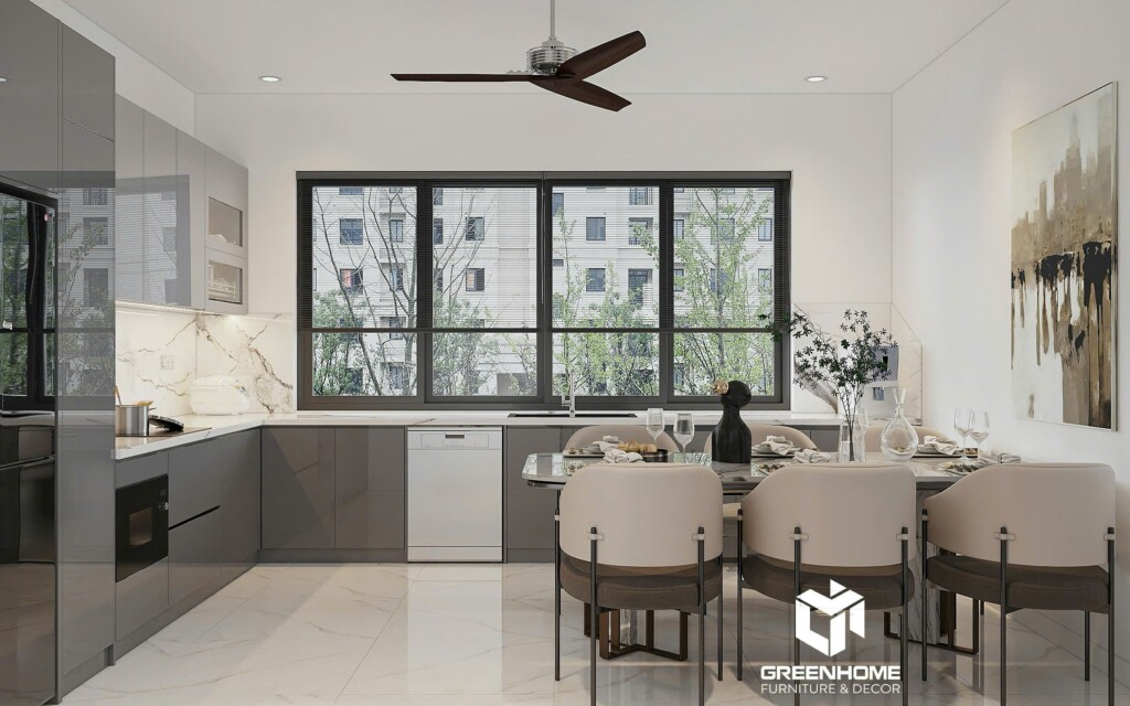 Căn bếp nhỏ thoáng đãng với cửa sổ đón nắng. Mang lại ánh sáng tự nhiên và không khí trong lành, tạo cảm giác thoải mái khi nấu nướng. Tích hợp với đó là khu vực ăn uống gọn gàng, tiết kiệm diện tích nhưng vẫn đảm bảo sự tiện nghi.