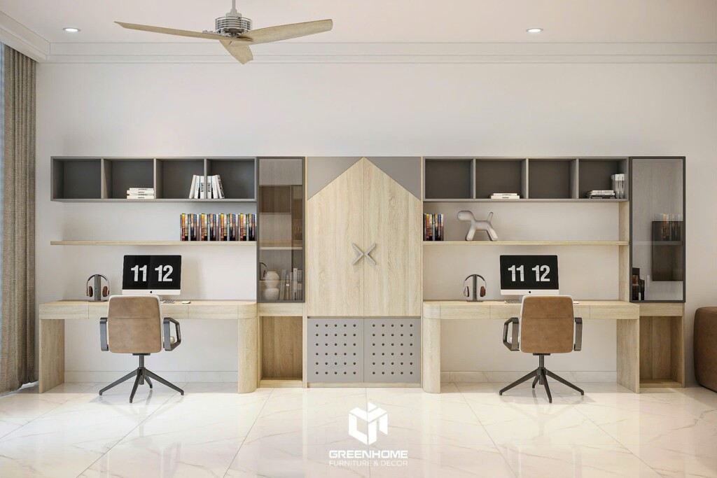 Đặc biệt, sự sắp xếp có chủ ý của kiến trúc sư khi thiết kế không gian làm việc và học tập đối diện nhau không chỉ giúp tạo sự cân bằng giữa các khu vực chức năng mà còn thúc đẩy tương tác và hỗ trợ lẫn nhau. Việc bố trí này mang đến sự kết nối liền mạch, giúp người sử dụng dễ dàng chuyển đổi giữa làm việc và học tập một cách linh hoạt, đồng thời tận dụng ánh sáng tự nhiên và tạo cảm giác thoải mái trong suốt quá trình sử dụng.