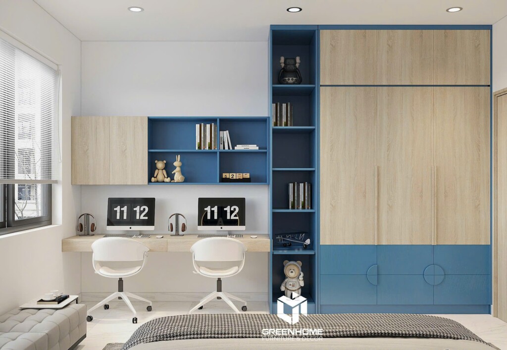 Căn phòng ngủ tiếp theo dành cho 2 bé với những đường nét tinh tế, bố trí cùng với họa tiết hợp độ tuổi của trẻ. GreenHome các bé sẽ được lớn lên một cách lành mạnh trong môi trường này.