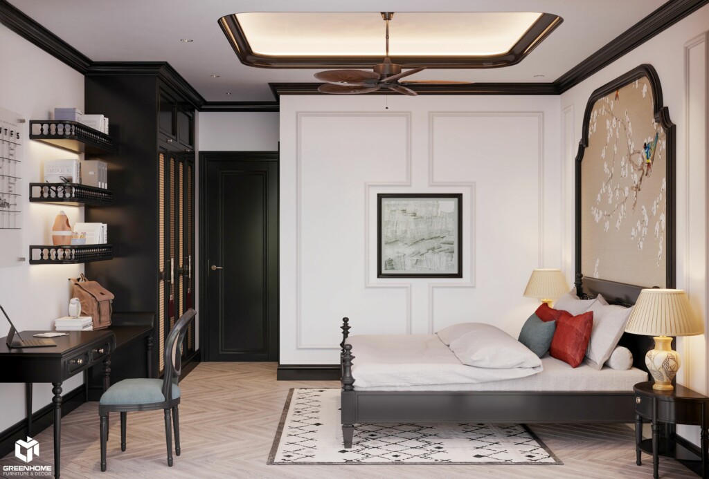 Tầng trên là không gian dành cho các phòng ngủ, nơi lý tưởng để nghỉ ngơi và thư giãn. Không chỉ chú trọng vào thiết kế phòng ngủ master, các kiến trúc sư của GreenHome còn tỉ mỉ chăm sóc từng chi tiết nhỏ trong các phòng ngủ thường. Mỗi căn phòng đều mang những nét đặc trưng và độc đáo riêng. Dưới đây là một số góc nhìn trong các phòng ngủ thường của dự án thiết kế nhà ở phong cách Indochine tại Vũng Tàu lần này của chúng tôi.