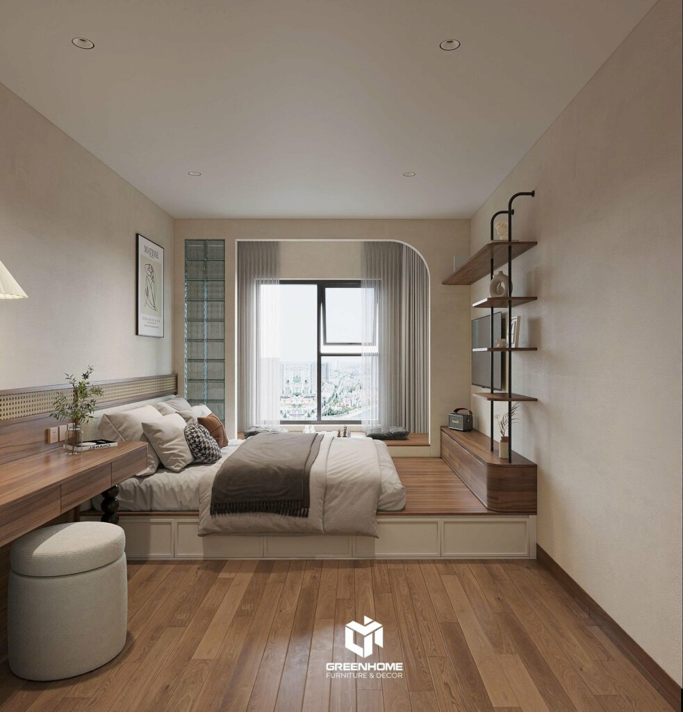 Cửa sổ lớn kết hợp rèm voan hai lớp giúp điều tiết ánh sáng, tạo nên không gian nghỉ ngơi dịu mắt. Tông màu kem – nâu nhạt đem lại cảm giác thư giãn và dễ chịu sau mỗi ngày làm việc.