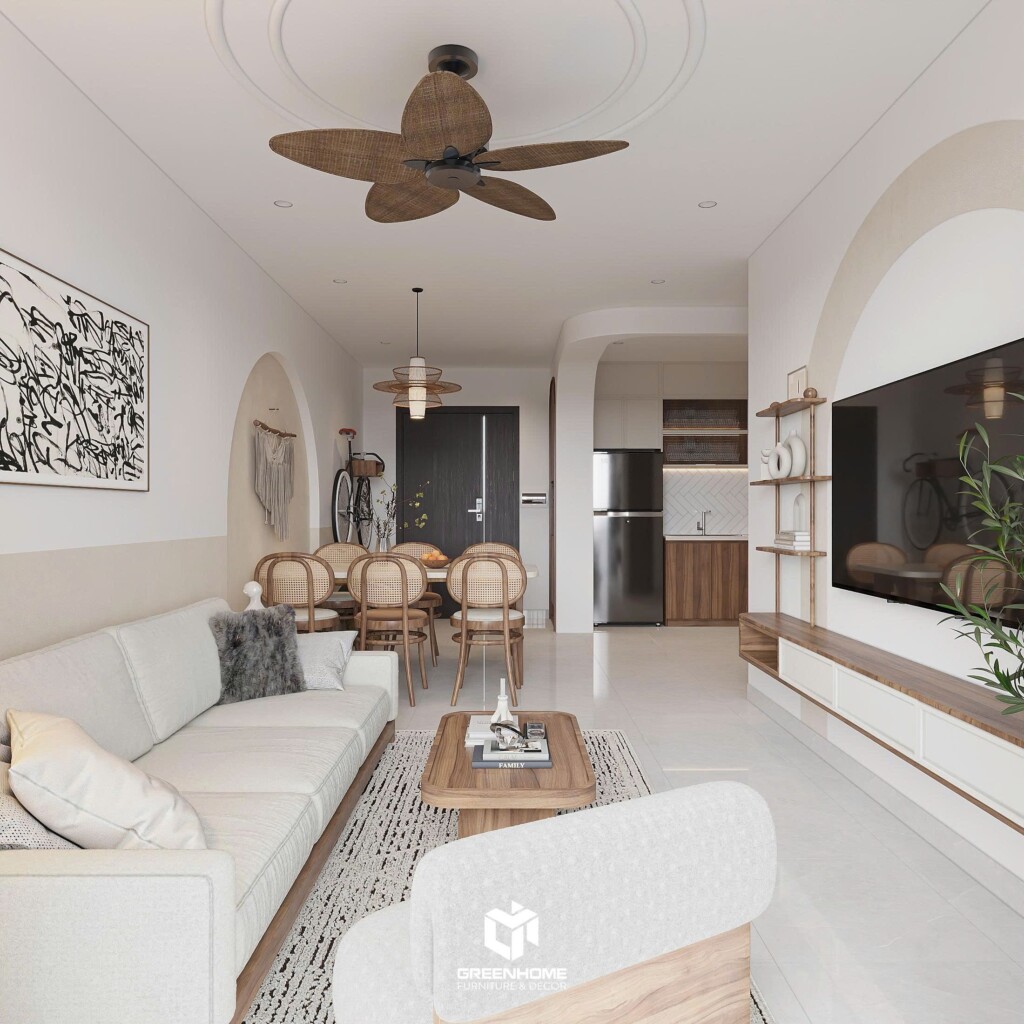 Thiết kế nội thất căn hộ theo phong cách nhiệt đới hiện đại là sự kết hợp hài hòa giữa chất liệu tự nhiên và thẩm mỹ đương đại. Tông màu trung tính chủ đạo, ánh sáng chan hòa và các chi tiết mây tre đan tinh tế mang lại không gian sống nhẹ nhàng, ấm cúng và thanh lịch.
