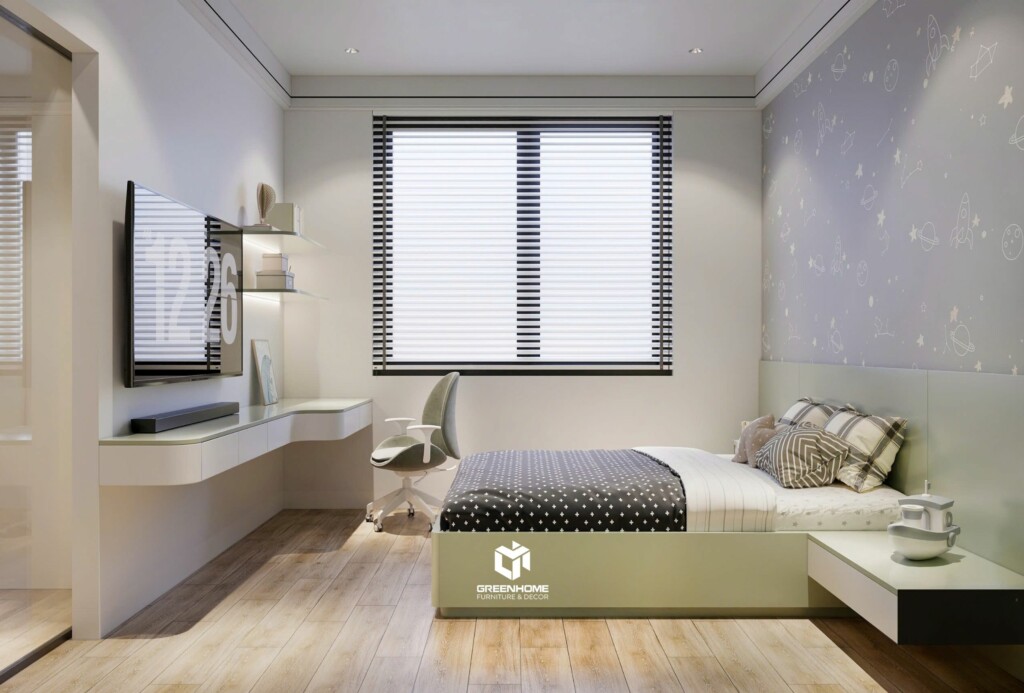 Phòng ngủ trẻ con có nội thất với họa tiết đáng yêu đúng với độ tuổi của bé. Các đường nét cũng được tối giản để tạo môi trường an toàn cho trẻ. Màu xanh lá cũng được sử dụng để mang lại cảm giác tươi mới, gần gũi với thiên nhiên, đồng thời tạo ra một không gian yên bình và thư giãn cho bé. Màu xanh lá còn được biết đến là một màu sắc giúp trẻ cảm thấy thoải mái và phát triển một cách tự nhiên. Đồng thời, đây cũng là màu sắc mà bé yêu thích.