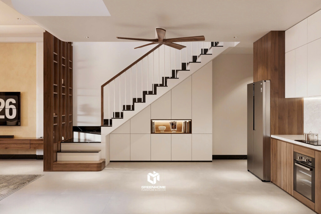 Phần kệ bếp kiểu chữ L tiện ích và tối ưu công năng. Khoảng trống dưới chân cầu thang cũng được tận dụng để bố trí kệ tủ thông minh. Nhìn chung, tuy diện tích khá hạn chế nhưng kts của KGX đã “hô biến” không gian khách bếp thật thẩm mỹ mà vẫn tiện ích vô cùng.