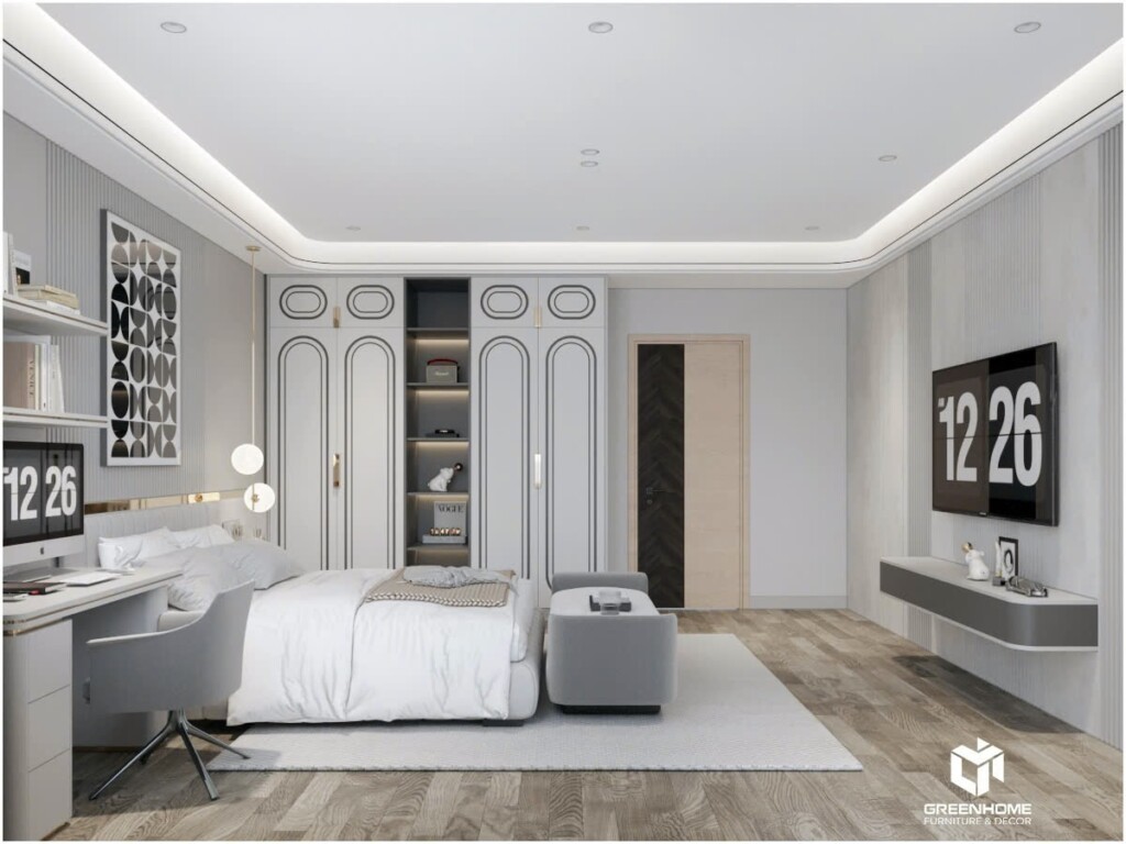 Tuy đơn giản hơn so với nội thất phòng ngủ master nhưng nội thất phòng ngủ thường không hề đơn điệu. Phòng ngủ làm theo phong cách monochrome hiện đại với tông màu xám và trắng tạo nên không gian thanh lịch và sang trọng. Sàn gỗ xám nhạt trải dài, mang đến sự ấm áp và đồng bộ với tông màu tổng thể. Trần nhà phẳng, kết hợp đèn âm trần tinh tế, mang đến không gian mở rộng rãi và hiện đại, toát lên sự tối giản và trang nhã cho thiết kế nội thất cao cấp.