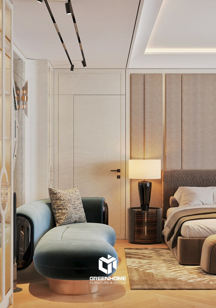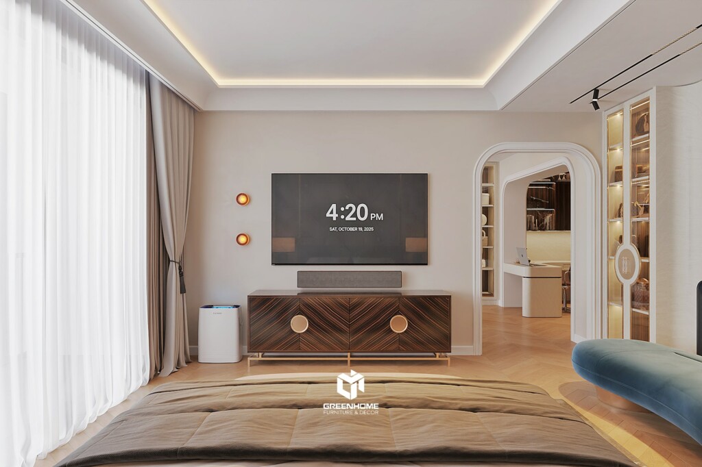 Tủ âm tường, vách trang trí và nội thất liền khối giúp căn phòng luôn gọn gàng, mang lại cảm giác thư giãn đúng nghĩa sau một ngày dài.