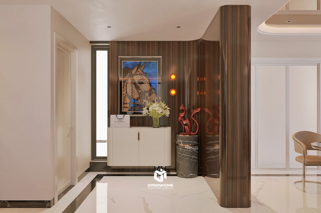 Hệ vách ốp, trần giật cấp và đèn trang trí giúp không gian trở nên nổi bật mà không phô trương, tạo ấn tượng ngay từ khi bước vào nhà.